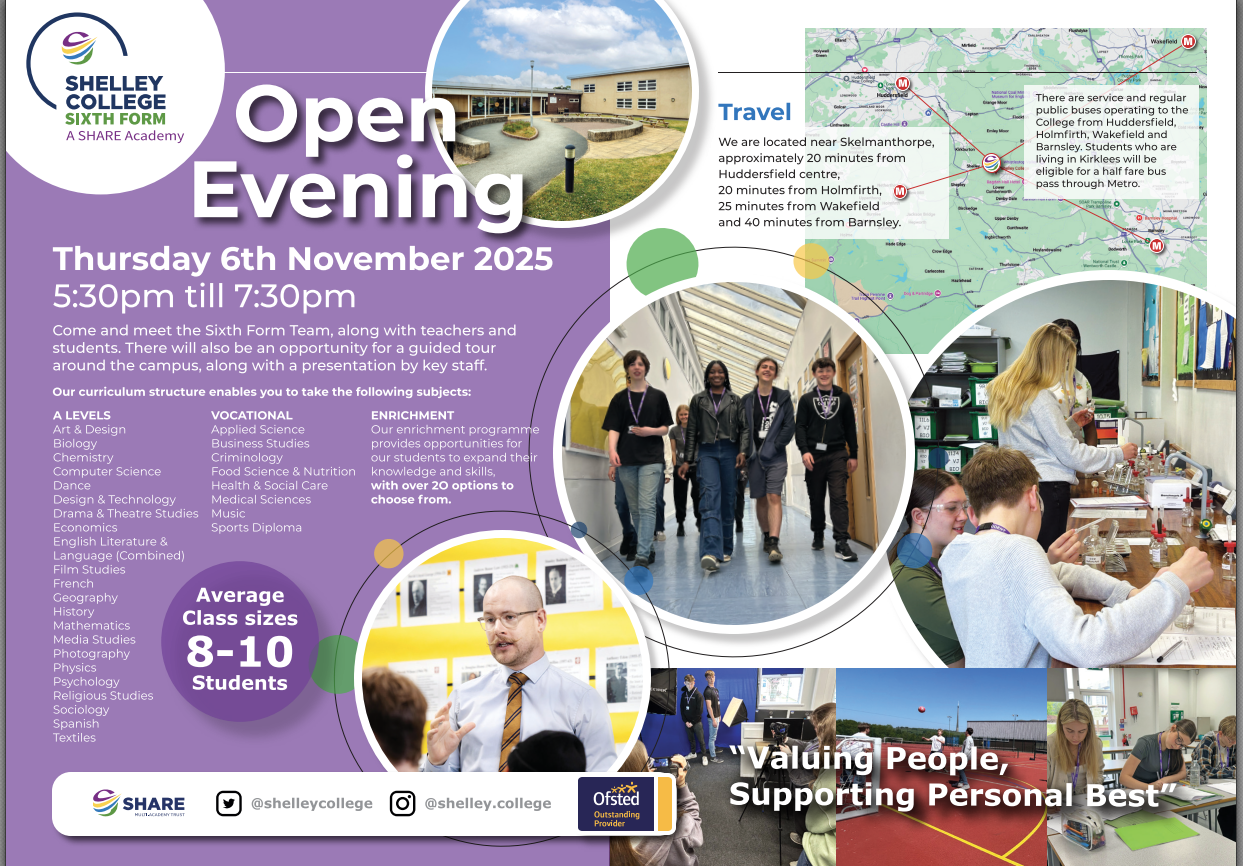 Join us at our Sixth Form Open Evening on Thursday, 6th November 5.30 - 7.30pm.  This is a fantastic opportunity to speak to subject staff, ask questions about the sixth form and meet the team!
